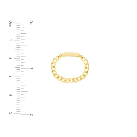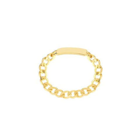 Modern meets classic! This 14k yellow gold ring has a curb chain band and an ID plate that could be engraved by your local engraver. Chain is 3mm wide and the ID plate is 10x3.5mm. Expertly crafted and will compliment any outfit for any occasion! Gift boxed for safe shipment and ready to give!