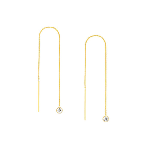 14k yellow gold elegant threader earrings have chain with bezel-set 3.5mm cubic zirconia front drops and bar back drops. When draped on the ear as shown, earring drop length in front is approximately 45mm and back is 50mm. The bar is approximately 18mm in length. The chain is diamond-cut cable.
