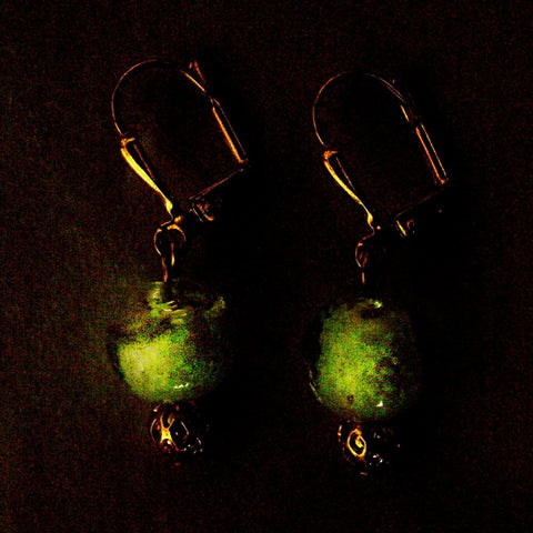 Glow in the dark earrings have 12mm handmade lampwork glass beads with glow-in-the-dark speckles. The beads dangle off earwires with a latch back and have a gold-tone accent bead at the bottom. Earrings hang approximately 35mm. Available in a variety of colors.