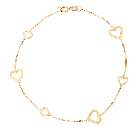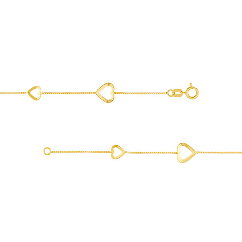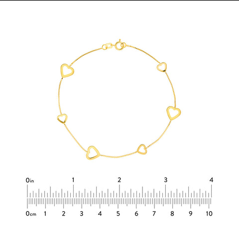 This 7.5-inch bracelet has a box chain with stations of alternating larger and smaller hearts. 14k yellow gold with a spring ring clasp. Hearts are approximately 7mm and 5mm. Matching necklace is also available. Beautifully packaged in a gift box to keep it safe in shipping and suitable for giving as a gift!