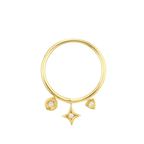 14k gold ring with dangling charms in three different shapes - round, star, and triangle. Each charm has a small diamond set in the center, and the total diamond weight is 3.9 points. Packaged in a beautiful jewelry gift box to ensure safety in shipping and ready to give as a gift.