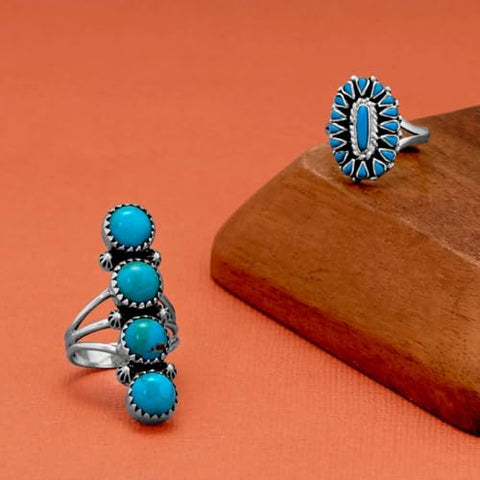 This beautiful blue turquoise ring just blossoms with style! Perfect for spring (or any time), the ring has 16 reconstistuted turquoise stones set in quality sterling silver with oxidized finish to bring out detail and add depth. A split band adds to the unique design. Handmade in the Phillippines and available in sizes 6, 7 and 8. .925 sterling silver.
