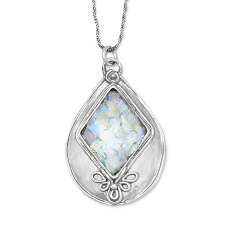 This 18-inch antiqued finish sterling silver necklace has a textured 25mm x 41 mm pear shape pendant. The pendant features a 17mm x 22mm diamond shape Ancient Roman glass center. Color of Roman glass will vary. The necklace has a lobster clasp closure.